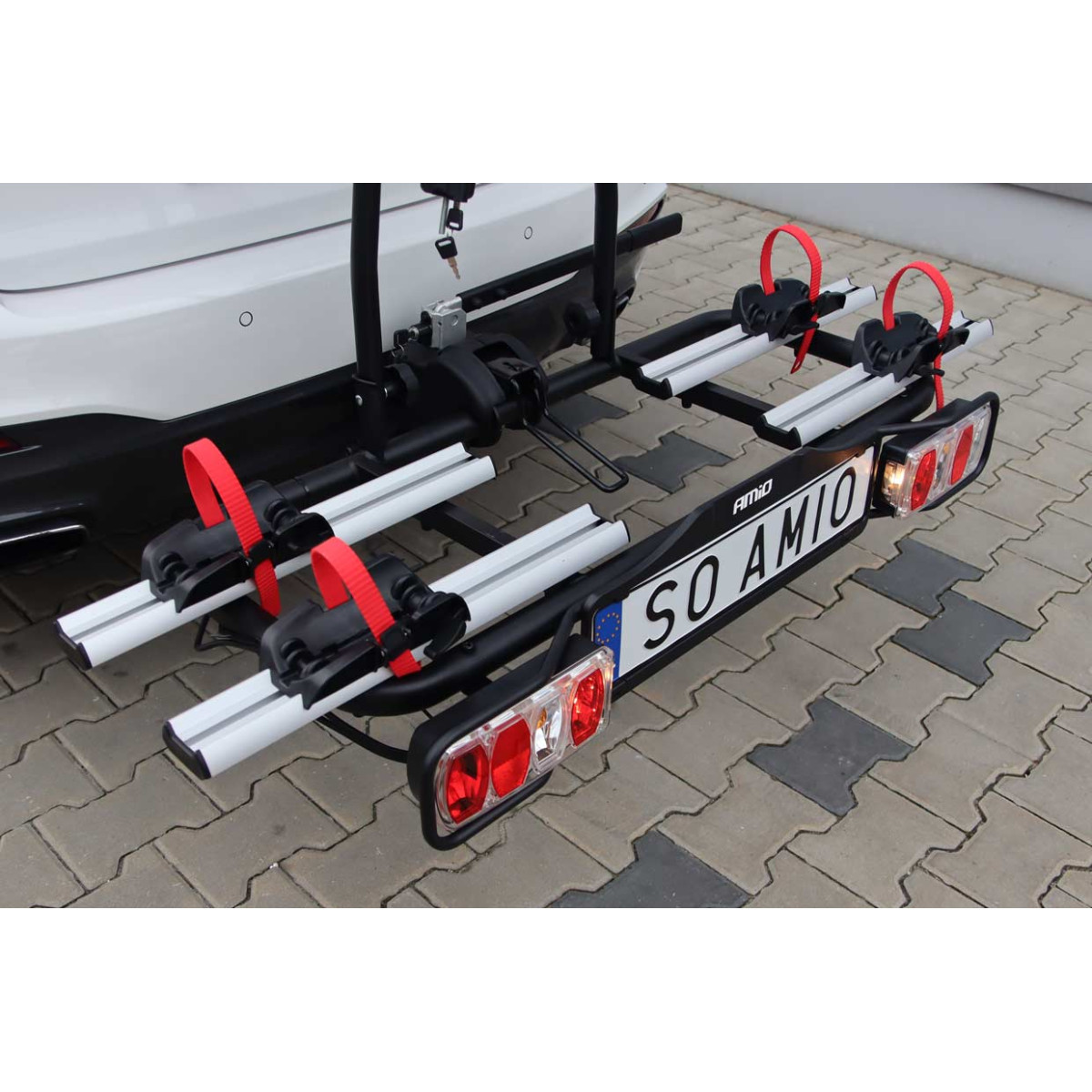 Very convenient system of mounting the bikes on the carrier - just detach the mounts, put the bikes through, secure with a branch with a key and you're done