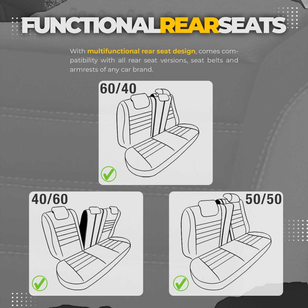 Päälliset sopivat useimpiin markkinoilla oleviin istuimiin (takaistuimen päällinen on täydellinen, ilman vetoketjuja).