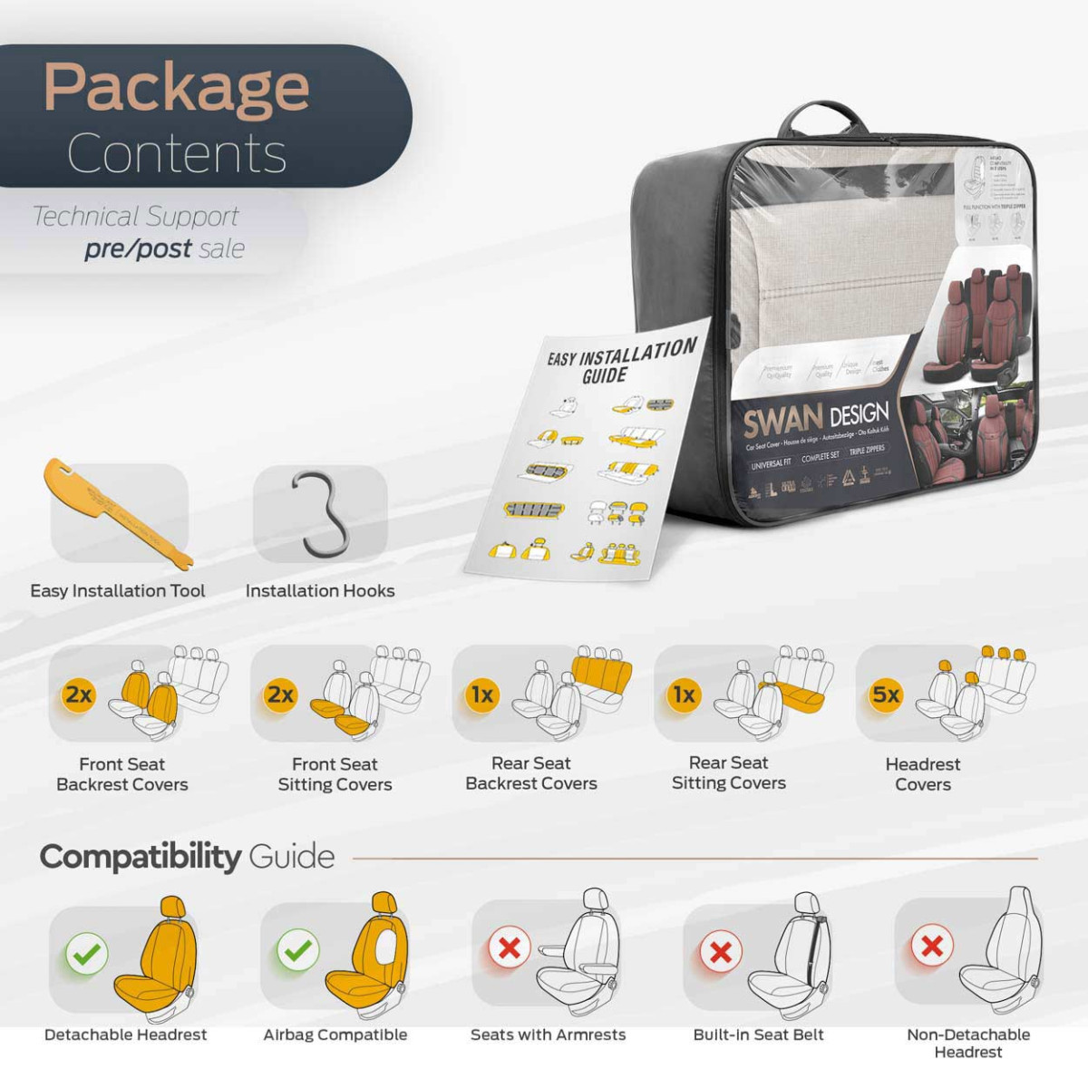 Vakiokokoisissa suojuksissa on sertifioitu AIRBAG- sauma, joten ne sopivat autoihin, joissa on molemmat sivuturvatyynyt istuimissa, sekä vakioistuimiin. Erikoisen kierrerakenteensa ansiosta suojukset ympäröivät istuimet kokonaan häiritsemättä turvatyynyjen toimintaa.
